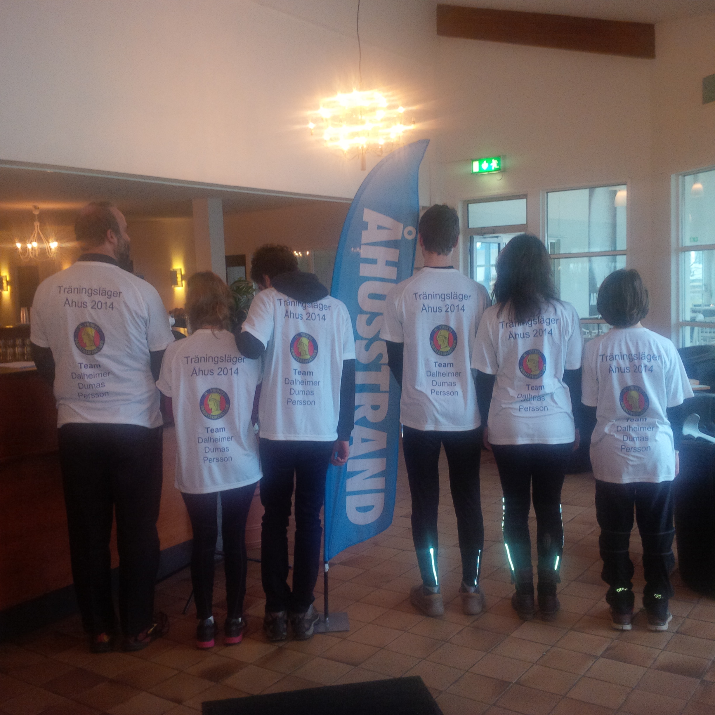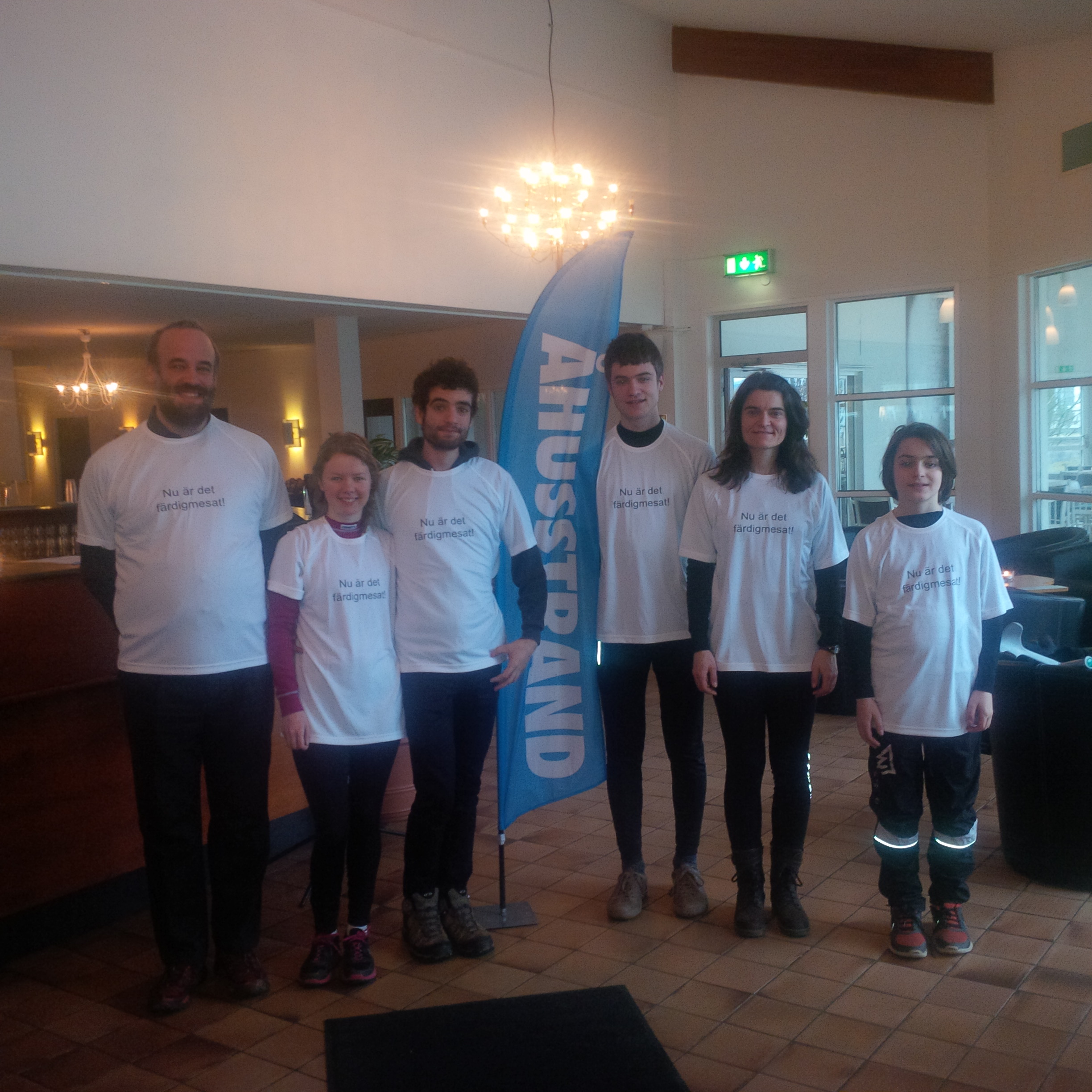 Efter att Tim tidigare hade åkt Kortvasan (i blötsnö och regn), så blev det på sportlovstisdagen en tur till Mora till, den här gången med Jan som åkte Halvvasan. Mycket bättre väder, bra tid, och direkt efteråt åkte vi hem, slängde in en massa tvätt i tvättmaskinen och började packa orienteringsryggsäckarna. Mycket tidigt på onsdag morgon åkte vi så tillsammans med Benoit och Jelena mot Skåne. Jag hade tryckt upp tröjar med ”Nu är det färdigmesat!” på, ifall att någon skulle försöka dra sig ur det digra träningsprogrammet. (Jag går fortfarande på kryckor, och är således bara tränare, då är det lätt att planera många pass :-)).