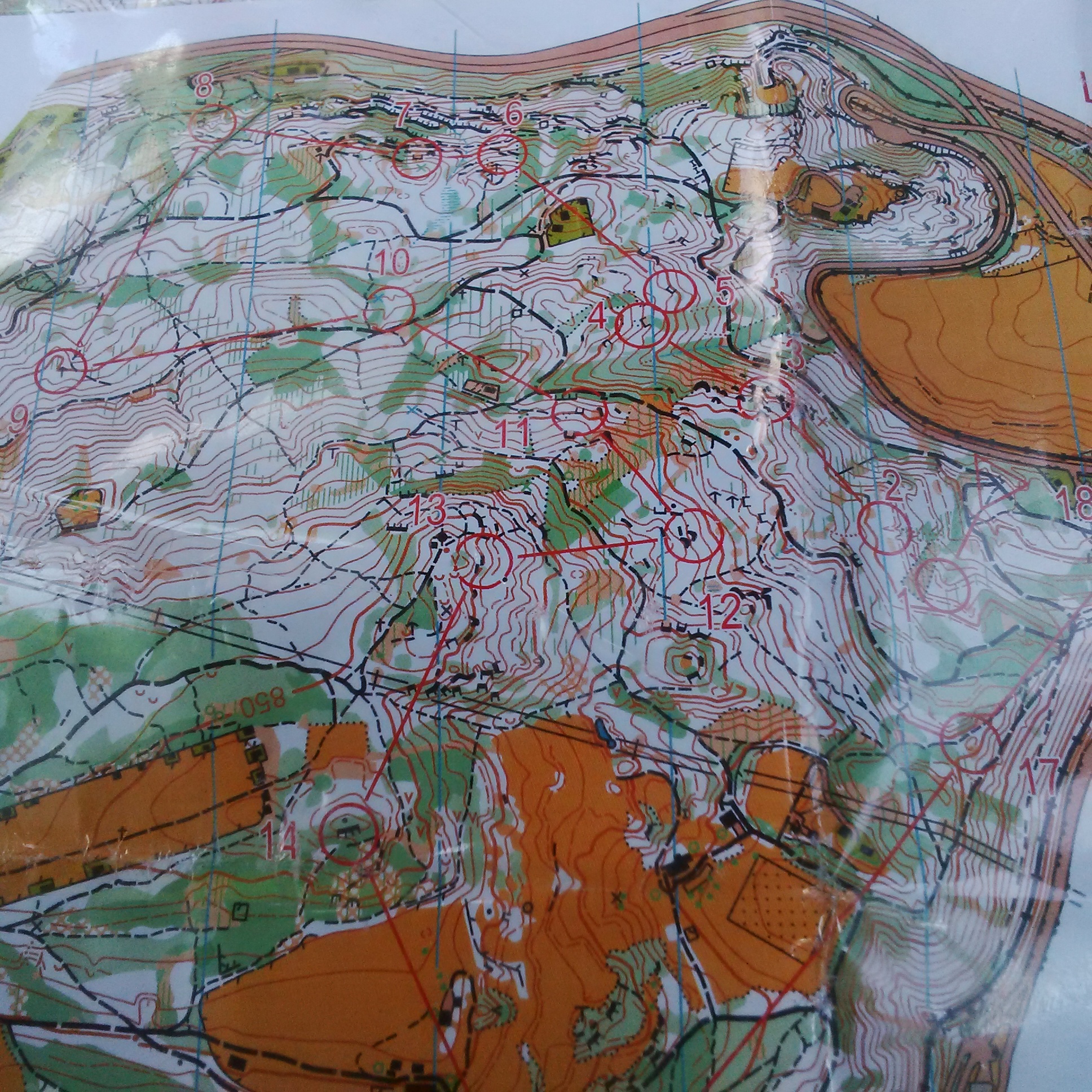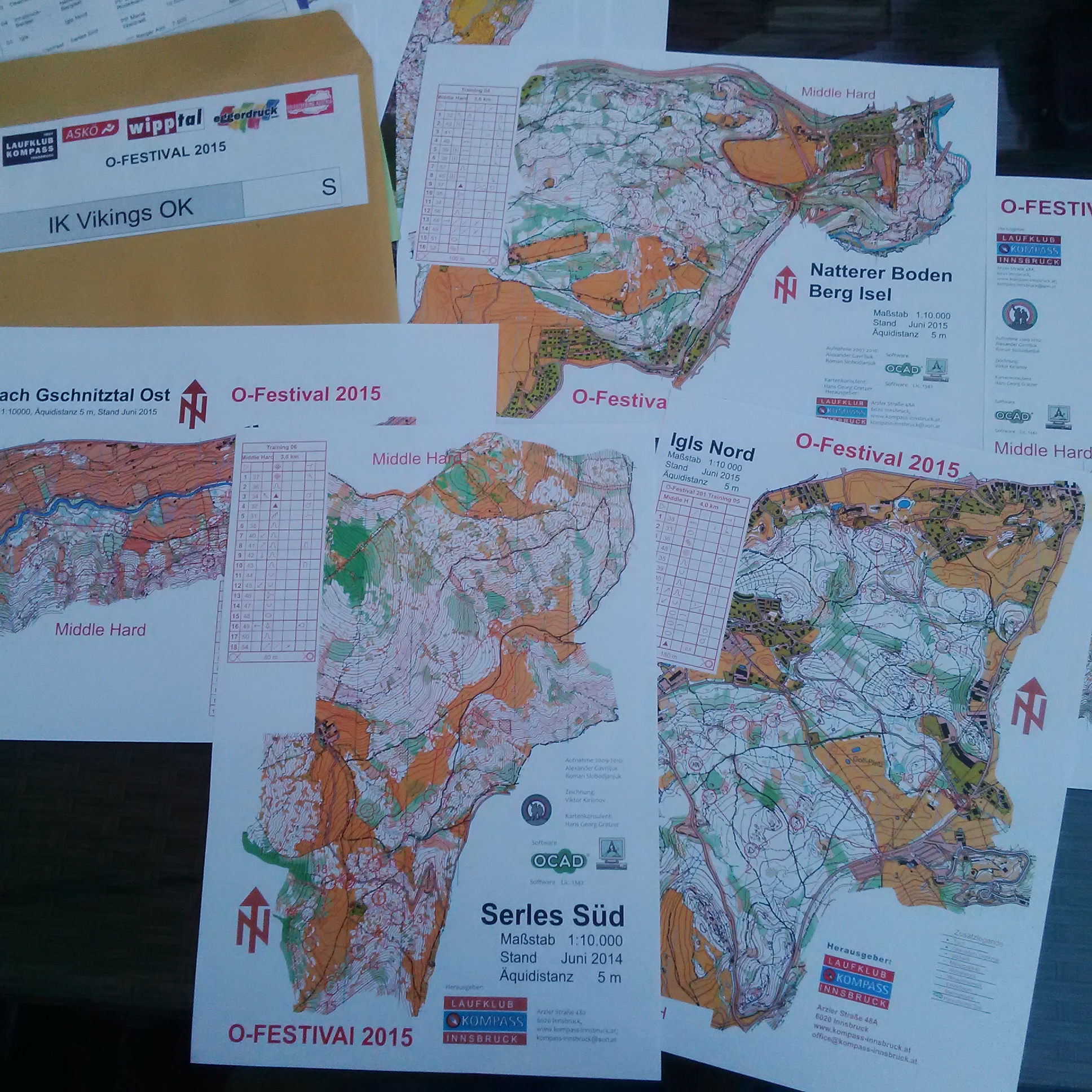 Tidig på torsdag morgon, när alla andra låg kvar och sov, satte jag på mig min orienteringsryggsäck och haltade ner till byn (det är lämpligt när man är på semester häromkring att man anpassar sin egen tidsrytm till ortsbornas – allt öppnar tidigt och stänger tidigt). Jag handlade till frukosten, allergimedicin till Tim på apoteket, och ytterligare träningskartor, och allt före kl 8:30. Men så var det ju klättringen uppför med den nu tunga ryggsäcken. Fortfarande ingen vaken, men till slut blev det frukost och mycket senare kom vi iväg. Pendeltåget tog oss till Innsbruck, lite administrativ trassel med våra veckobiljetter, men det gjorde i alla fall att vi fick se lite av gamla staden i Innsbruck, och åt även en god italiensk glass. Sedan med spårvagn till Bergisel och första träningen. Spårvagnshållplatsen visade sig dock att ligga en bra bit nedanför Bergisel, och vi satt ett tag i skuggan i gräset och funderade vart på orienteringskartan vi var. Till slut marscherade vi en brant serpentinväg uppför och kom in på kartan. Vi dumpade våra ryggsäckar vid parkeringens slut i skogsbrynet, bytte om, och gav oss, fortfarande i helt absurd hetta, iväg till banornas start vid Natterer Boden.