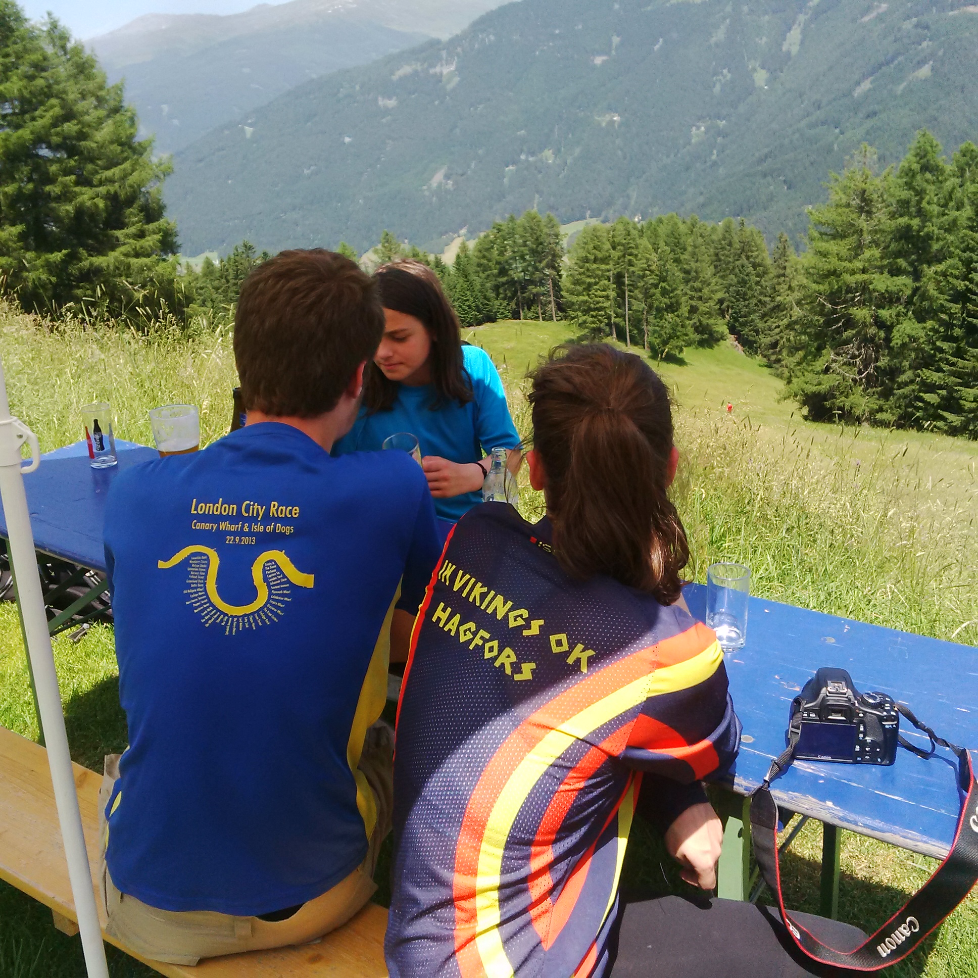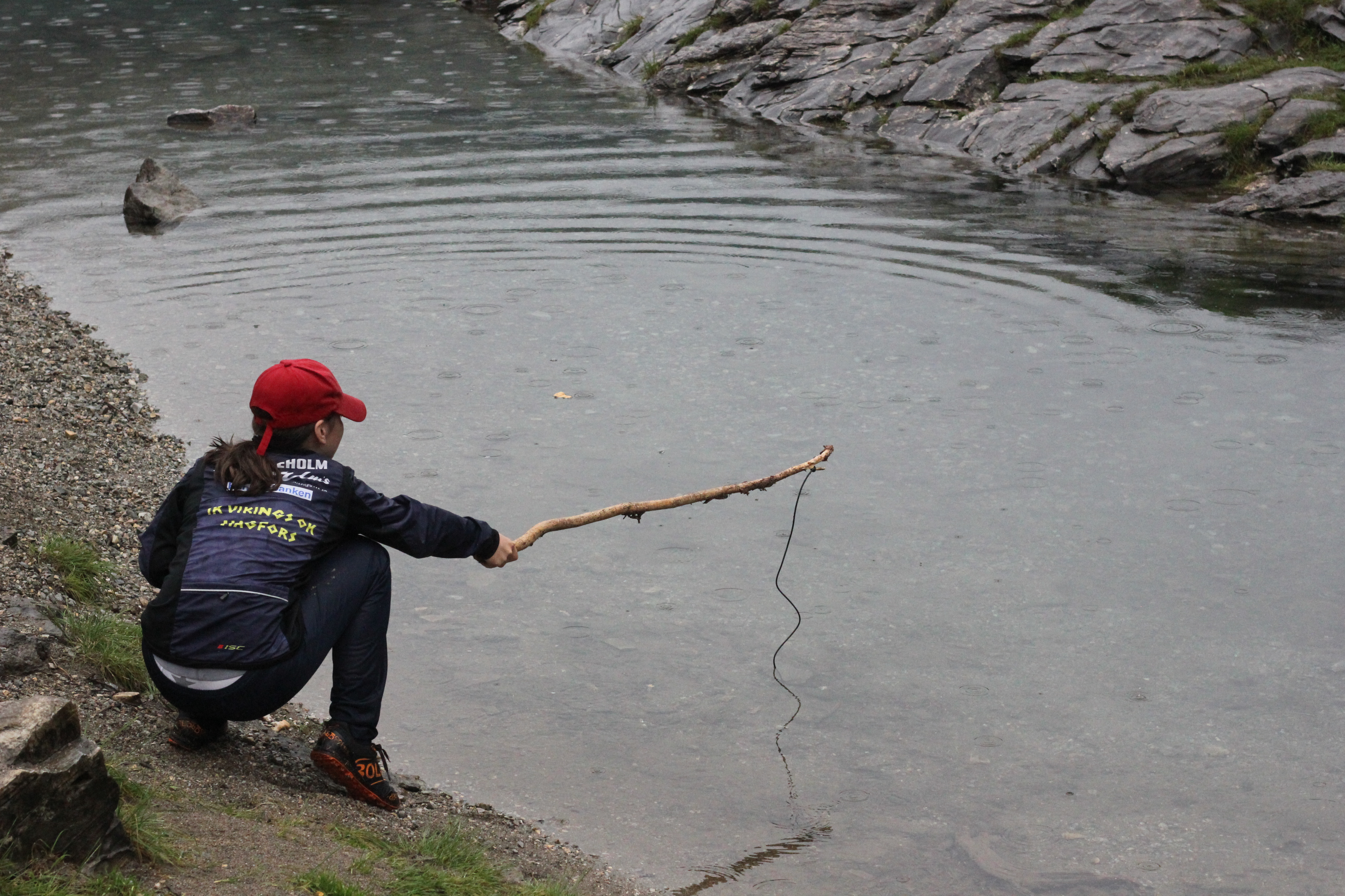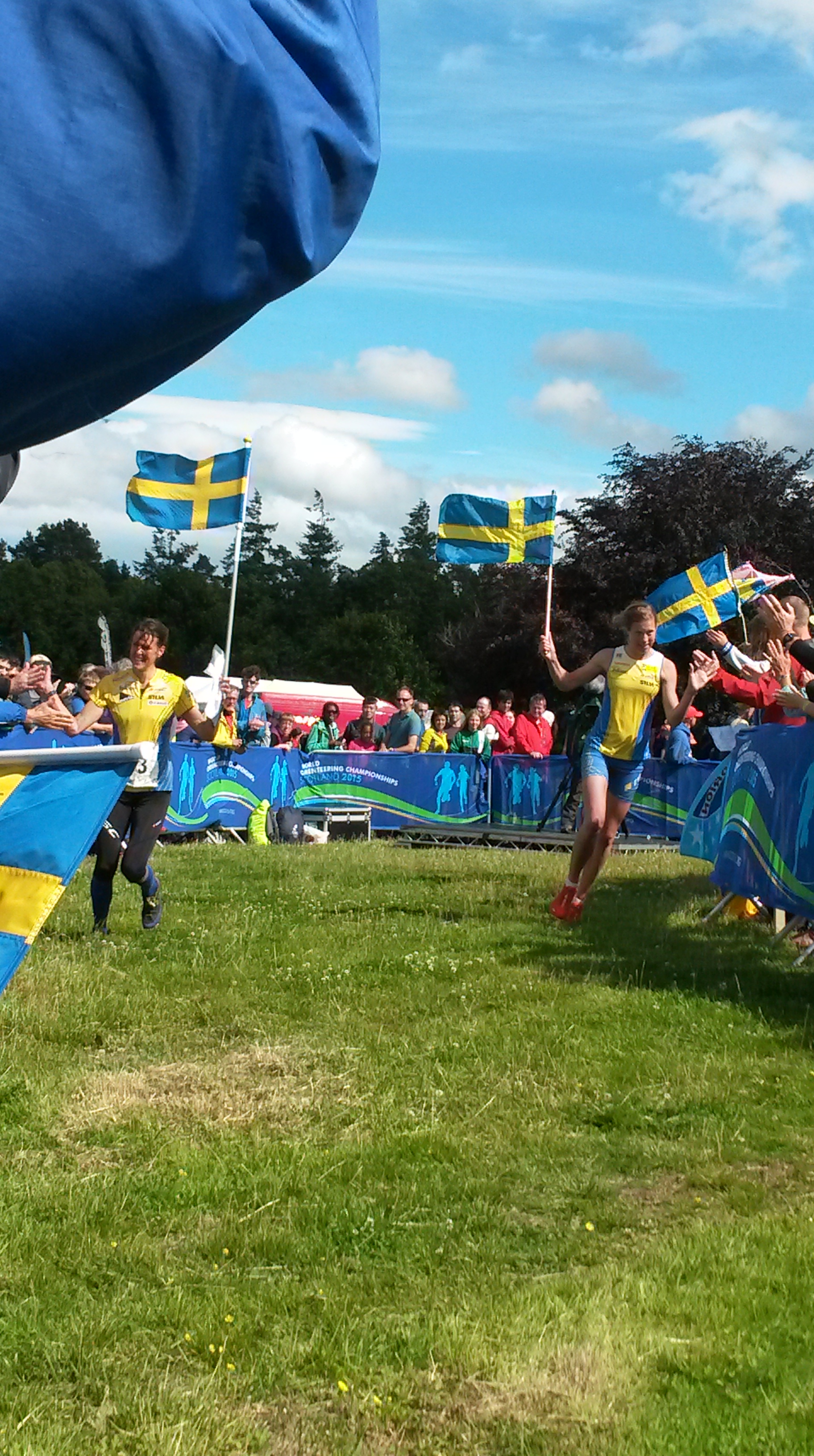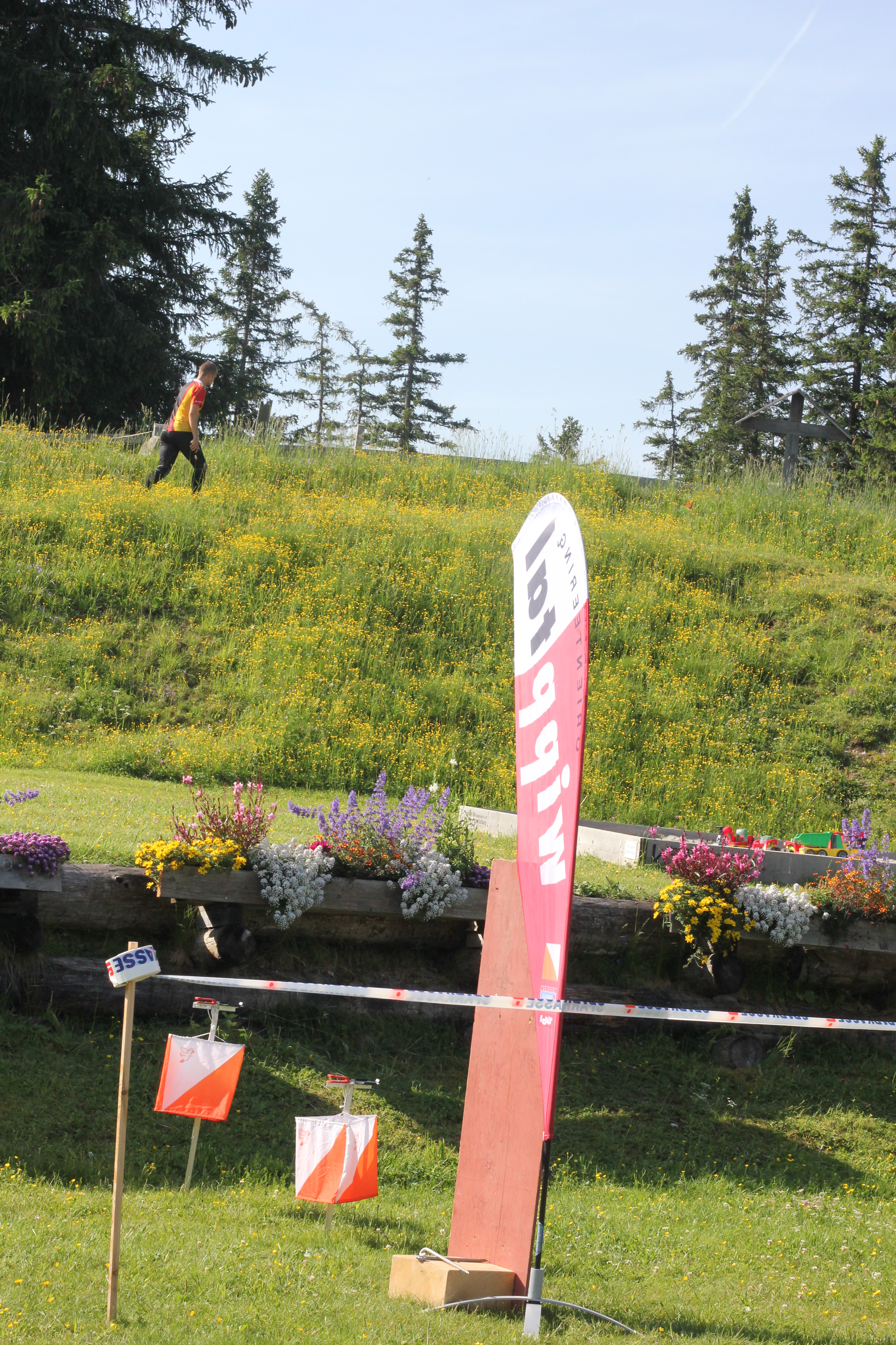 Nu följer ännu en stigning och jag har en duell med en man i min ålder, vi har inte samma kontroller, men det är tät gaffling så vi ser varandra hela tiden innan jag lyckas dra ifrån en bit i en utförsbacke. Dock gör jag en liten krok till näst sista kontrollen, och då är han ikapp. Nu följer en brant stigning uppför skogen mot en äng. Jag kör allt jag har och kommer förbi killen, och fyra stycken till. Över den sluttande (uppför, såklart) ängen, sista kontrollen, ännu en äng, och så växlingen. Tanja ropar något om Tims insulinpump som jag inte förstår, all fokus jag har nu är riktad mot andning och överlevnad.