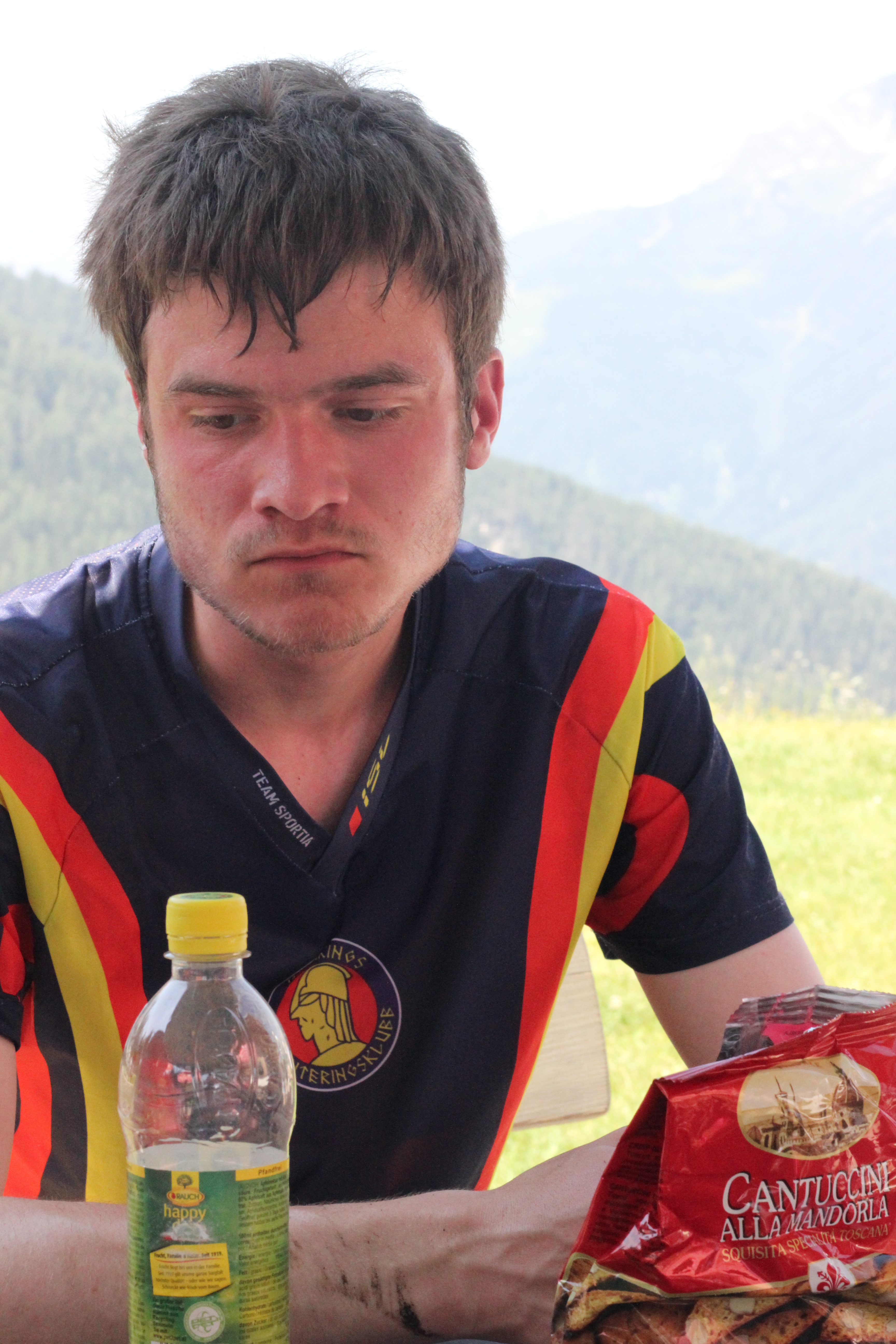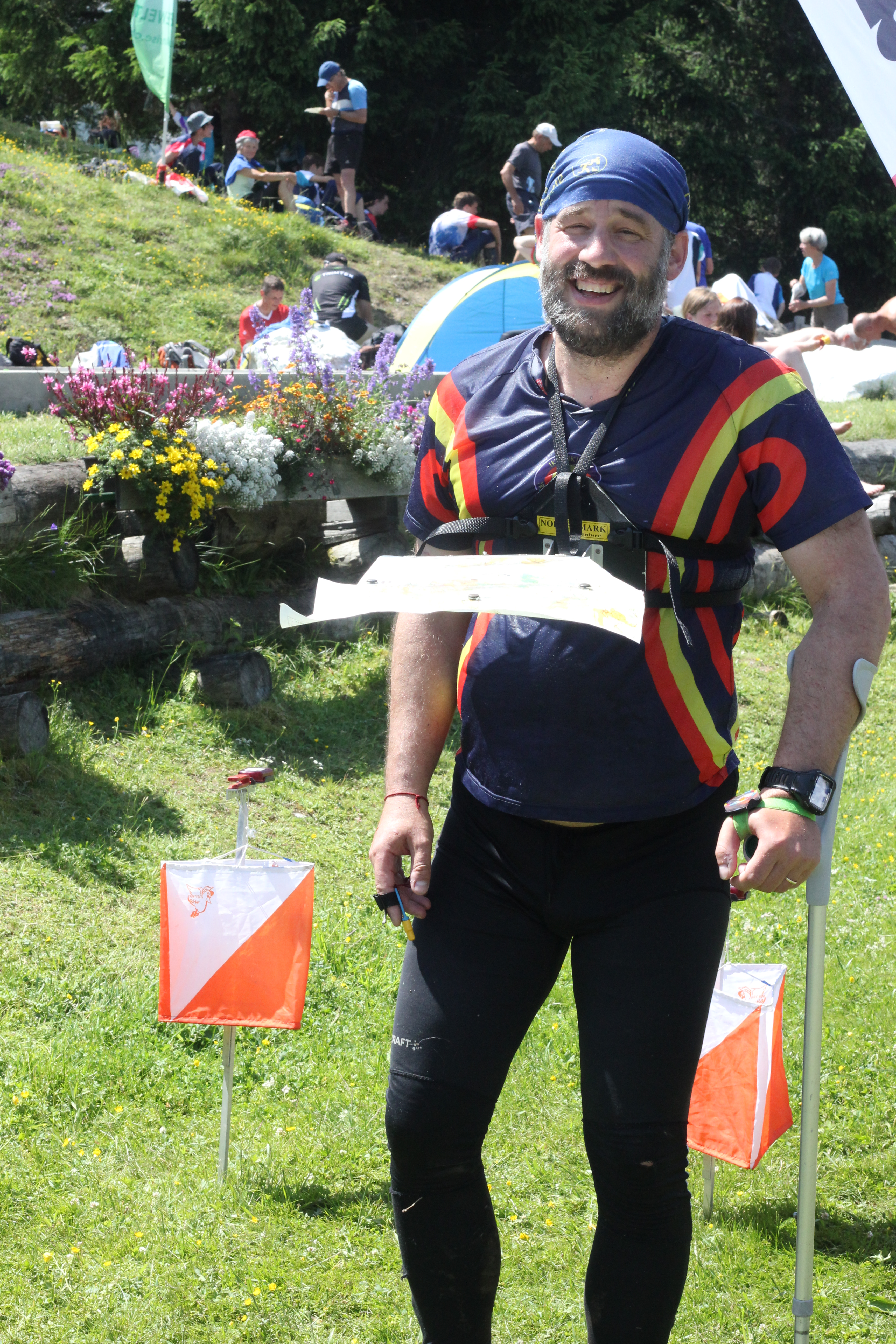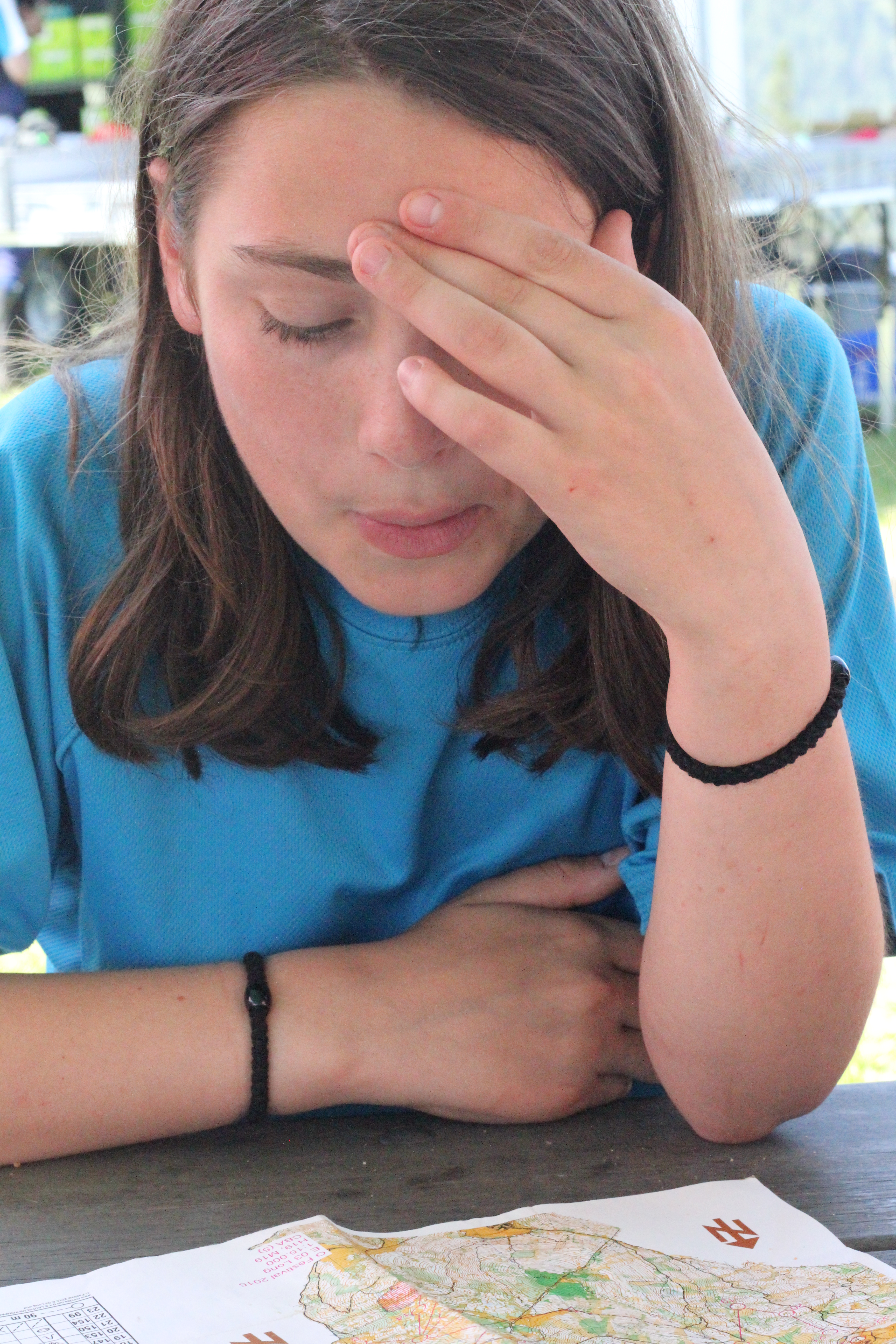 Nu följer ännu en stigning och jag har en duell med en man i min ålder, vi har inte samma kontroller, men det är tät gaffling så vi ser varandra hela tiden innan jag lyckas dra ifrån en bit i en utförsbacke. Dock gör jag en liten krok till näst sista kontrollen, och då är han ikapp. Nu följer en brant stigning uppför skogen mot en äng. Jag kör allt jag har och kommer förbi killen, och fyra stycken till. Över den sluttande (uppför, såklart) ängen, sista kontrollen, ännu en äng, och så växlingen. Tanja ropar något om Tims insulinpump som jag inte förstår, all fokus jag har nu är riktad mot andning och överlevnad.