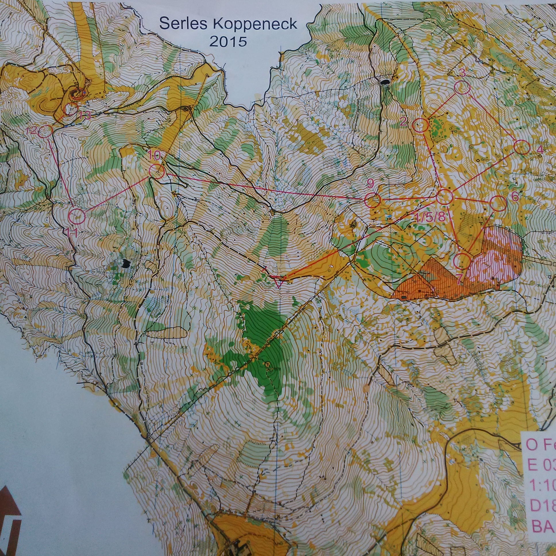 Nu kommer en kortare sträcka utför, men kontrollen är en grop utan tydliga hållpunkter i närheten. Dock finns det en sorts uppfångare bakom, en lång rad med gropar ca 15 meter längre ner. Ingen aning vad det är för något, ser nästan ut som en skyttegrav. Jag har tagit ut kompassriktningen och springer efter de andra men känner att de håller för långt mot höger. Jag saktar ner så att de inte hör mina gnisslande kryckor längre och fortsätter sedan åt det hållet som jag tycker är rätt, och mycket riktigt när jag dyker ner från en höjd är jag bara 10m från kontrollen. Jag stämplar och passerar de andra två som tittar på mig, tittar upp för berget, och förstår. Nu satsar jag givetvis allt jag har, det är ytterligare en långsträcka som går långt ner i dalgången för att sedan klättra upp på nästa stora höjd. På vägen upp funderar jag om jag ska runda höjden i sidled eller fortsätta rakt på och gör banans enda riktiga miss, jag fortsätter, och det kostar mycket kraft, så att kvinnan och jag kommer tillsammans till kontrollen. Tjejen orkar dock inte längre hänga med.