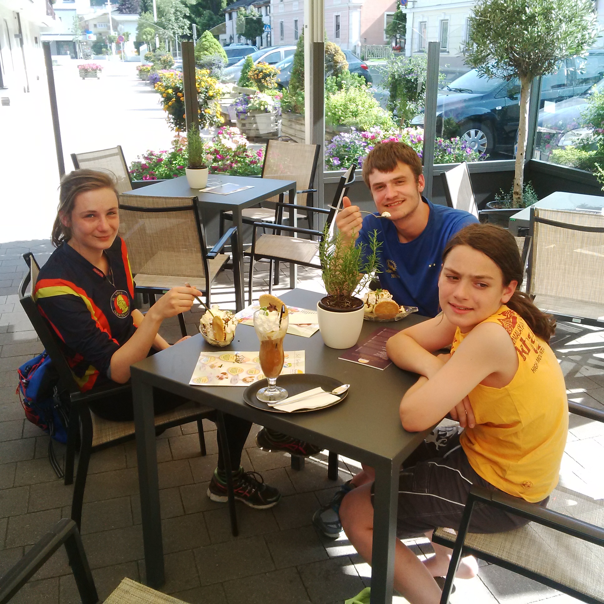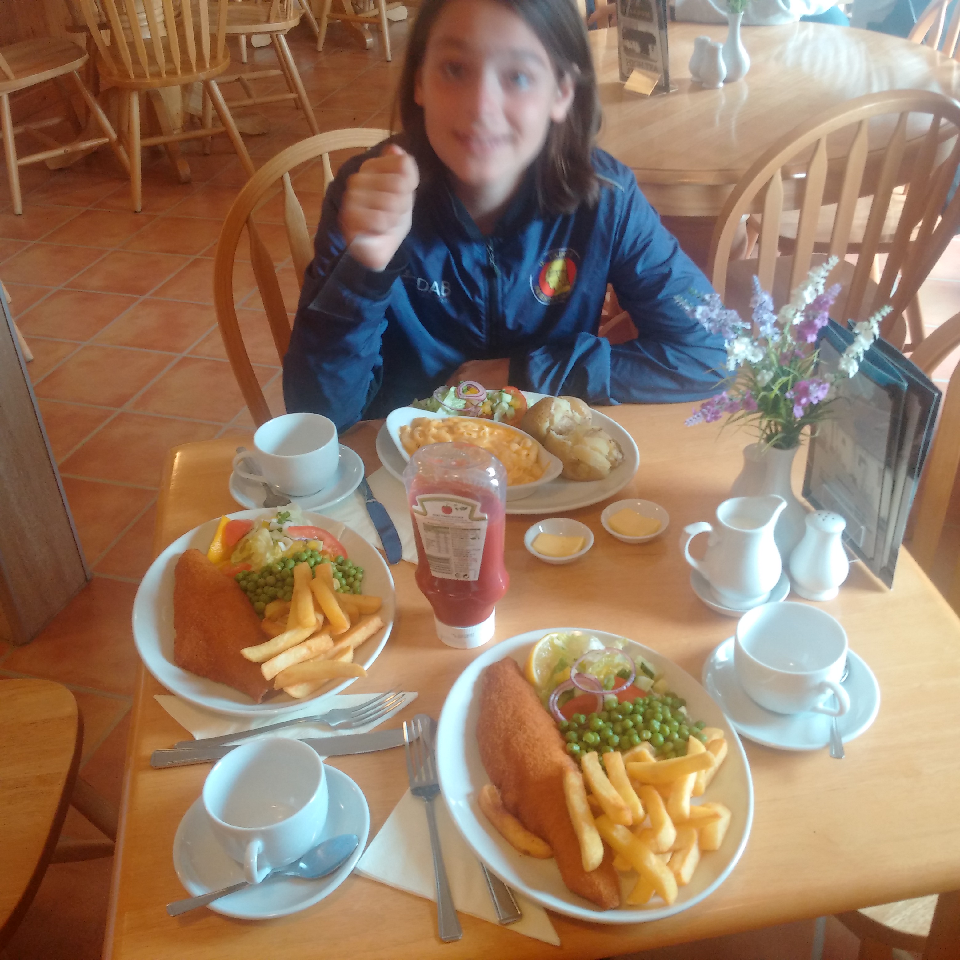 Såklart fick han sin ”bacon, ägg, and sausage roll” (vår favoritmat på brittiska orienteringstävlingar – allt som är dåligt för en människa inrullad i en serviett), och med lite varm choklad med marshmallows återfår man snart krafterna – vilket vi också behövde för den långa vägen tillbaka till bilen. En timme hem till gården, dusch, snabb ombyte och så iväg till Harrogate där Afternoon Tea på den berömda Betty’s Tea Salon väntade oss. (Fast först fick vi härda ut världens skyfall i våra finkläder på vägen från bilen dit.) Och Betty’s leverade, mycket bra Afternoon Tea i St James-klass, bra service, gott te, live pianomusik. Och så mycket mer blev det inte den kvällen, vi stupade i sängen allihopa ganska snabbt.