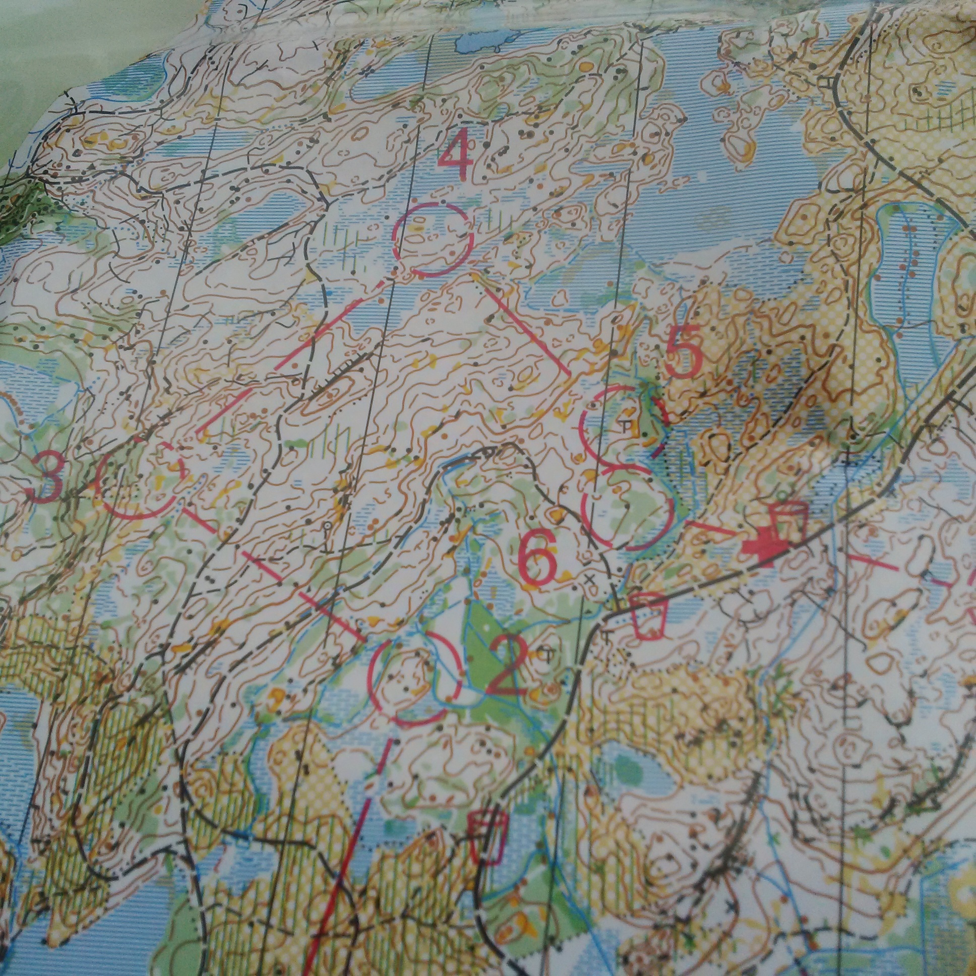 Nu följer ännu en långsträcka, och den genomför jag på ett ganska dåligt sätt. Det är många stigar på vägen, men ingen åt rätt håll, många diken, mossar, och jag har ingen bra plan, så jag springer bara på måfå åt ungefär rätt håll, och det kan ju inte bli bra, och det blir det inte heller. Jag blir ståendes förvirrad mellan två mossar innan jag kan läsa in mig, fortsätter, blir en kort stund förvirrad igen, men tar sedan kontrollen.