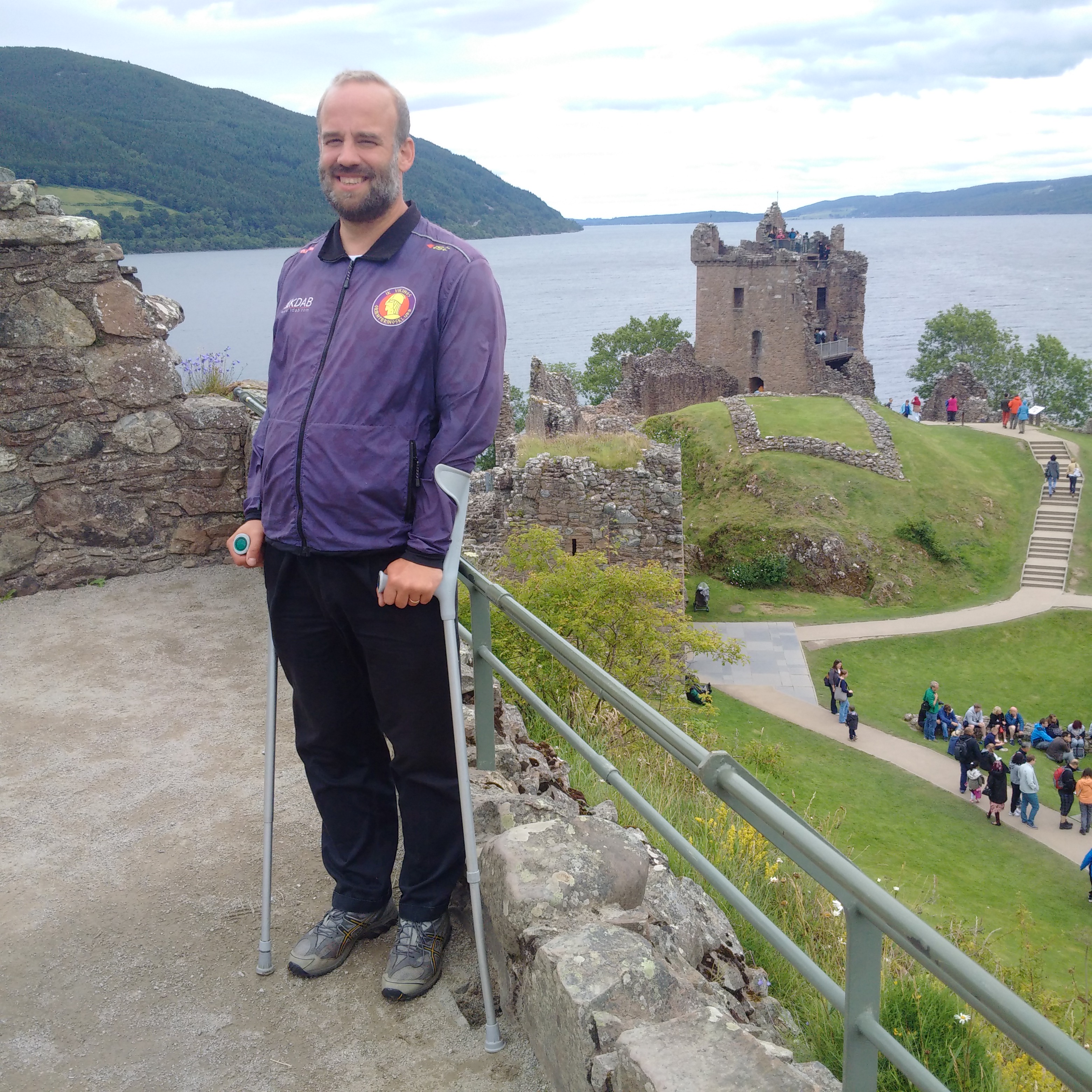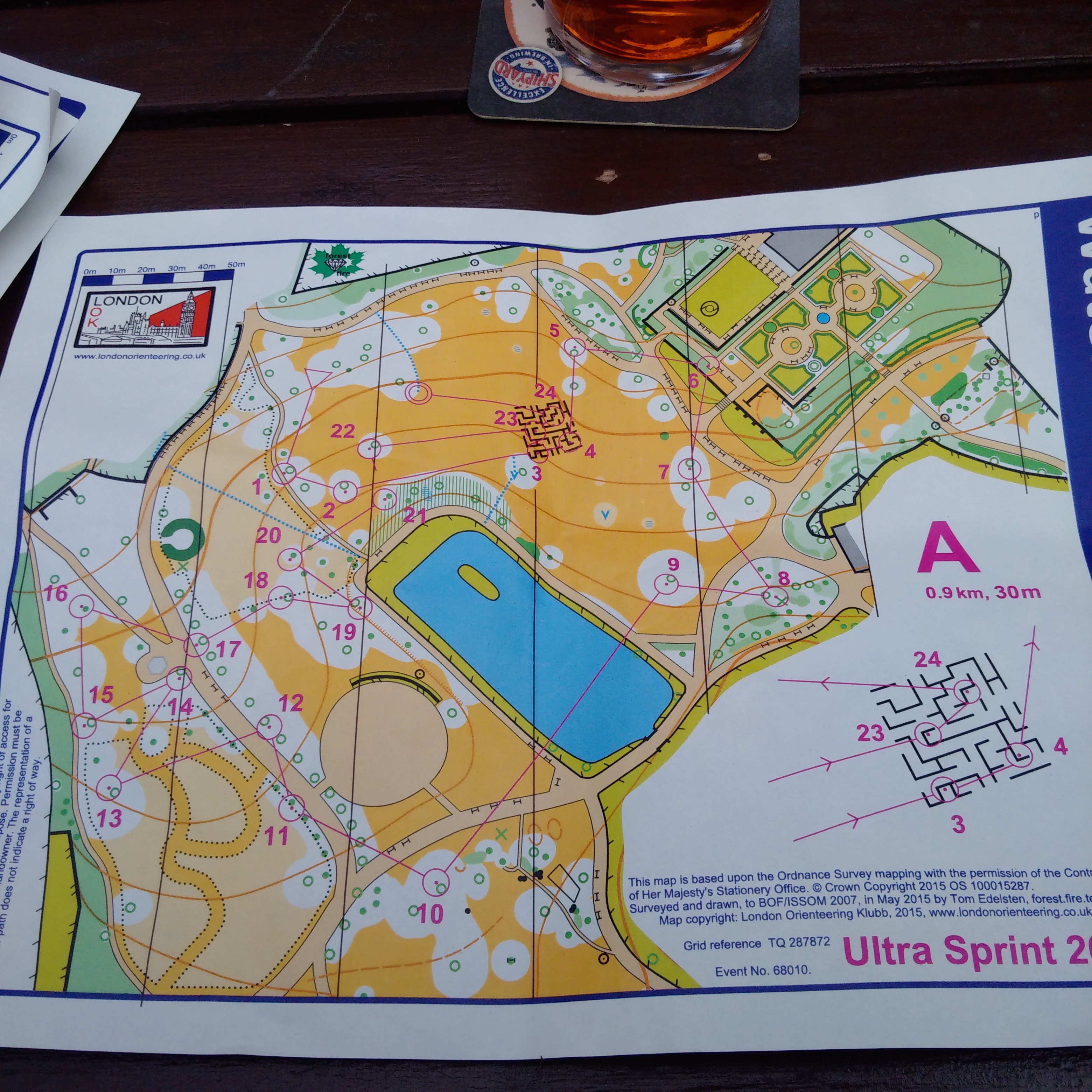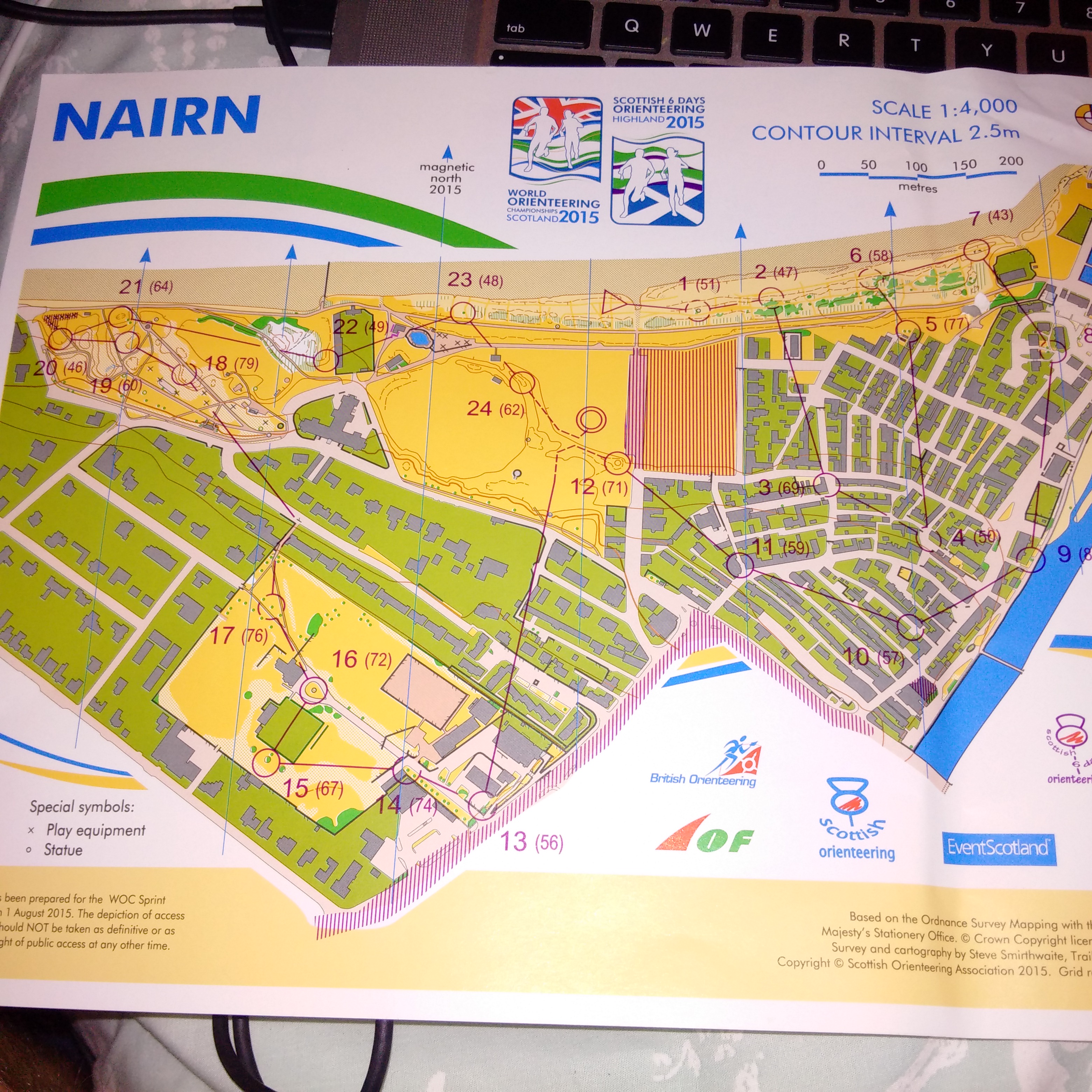 Väl framme vid Wass visade det sig att parkeringen var knepig. Det var vägparkering och vi fick köra kilometer efter kilometer långsamt förbi de redan parkerade bilarna, för att sedan gå samma väg (med mycket upp och ner) tillbaka. Vi hade mycket lite tid kvar när vi väl kom till arenan och fick snabbt byta om i dimma och lätt duggregn. Insulinpumpen förpackad, extra russin i fickan, och så sprang vi iväg mot starten (och hann nätt och jämnt alla tre). Själv sprang jag Light Green, den längsta motionsklassen (då H45S hade varit alldeles för lång, tyvärr). De första fyra kontrollerna spikade jag allihopa och hade till och mot bra fart under kryckorna, men sedan tappade jag ena kryckfoten, och då förlorade jag direkt mycket fart. Dock fortsatte orienteringen gå hur bra som helst, även om jag tröttnade mot slutet i de många branta stigningarna. När jag stämplade ut fick jag veta att jag var på femte plats av 25 i mål – mycket bättre än vad jag hade förväntat mig; visserligen visste jag att jag hade orienterat bra, men jag trodde inte att farten hade räckt till en framskjuten placering. Till slut kom jag dock på en 7:e plats av 73 deltagare, övre tiondelen, det är inte ofta jag kommer dit. Tanja gjorde också ett kanonlopp, med god marginal på övre halvan, kom i mål inte långt efter mig. Målet var utbrutet, och det var (ännu) en brant stigning upp till arenan. Vi väntade längre på Tim, blev oroliga, klättrade ner till målet (hela tiden med den vilt pipande insulinpumpen i handen), klättrade upp igen, ner igen, och så kom han till slut. Han hade sprungit i nästan två timmar, det är långa tuffa banor i H16A i England, och vi har inte så bra koll på hur vi ska hans blodsockersvängningar än alla gånger, speciellt inte när det är mycket långa tävlingar.