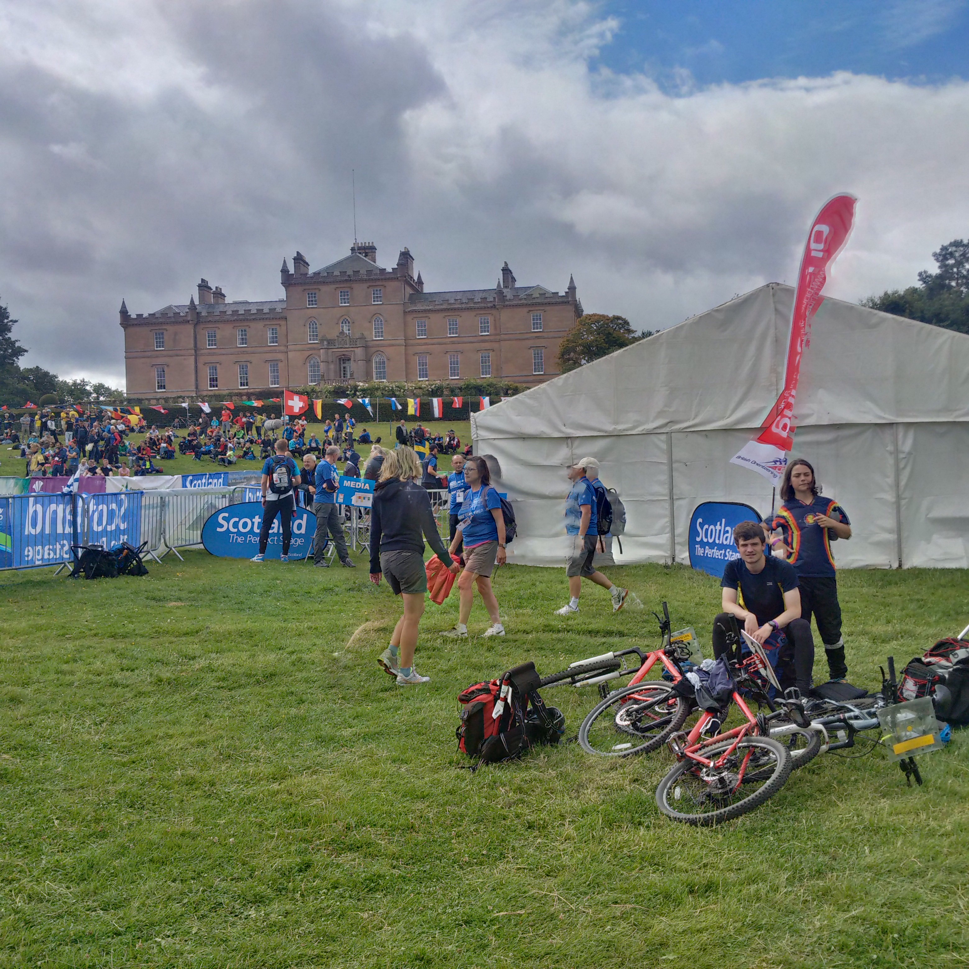 Fast det är kallt och blåser snålt så har det hittills mestadels varit torrt, och förblir också så när jag går i mål, i alla fall en liten stund till. Tanja kommer ganska snart, hon har haft en större bom, men annars mycket bra och kommer återigen att ligga på övre halvan (själv kom jag 8:a av 74 den dagen). Men nu brakar regnhelvetet loss igen, en sådan där tung hällregn igen precis som dagen innan i Harrogate. Stackars Tim som är kvar uppe på kalfjället (och, som det visar sig, har mycket kvar, återigen en tuff bana, 8,8 km, han är än en gång ute i nästan två timmar).